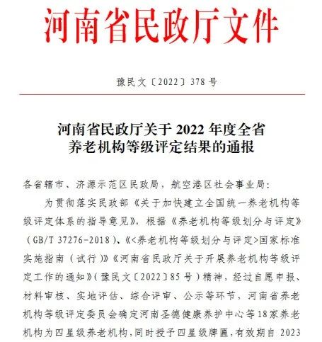 12月29日,河南省民政廳下發(fā)《關(guān)于2022年度全省養(yǎng)老機構(gòu)等級評定結(jié)果的通報》,華信圣德旗下養(yǎng)老機構(gòu)——河南圣德健康養(yǎng)護中心經(jīng)河南省養(yǎng)老機構(gòu)等級評定委員會評審確定為四星級養(yǎng)老機構(gòu),同時授予四星級牌匾,有效期自2023年1月至2026年1月。